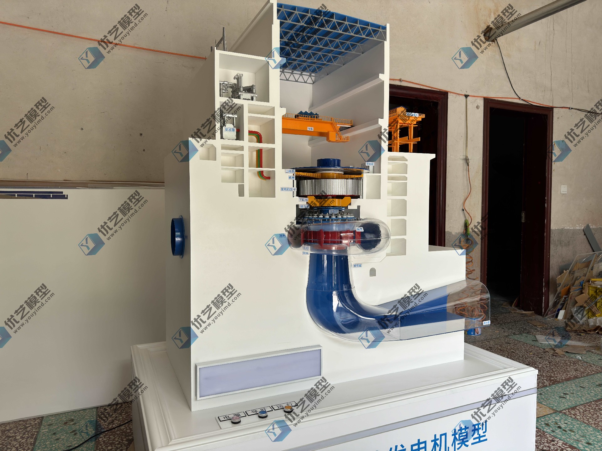 • 廠房結(jié)構(gòu): 展示水輪機(jī)運(yùn)行的環(huán)境,包括入水口、出水口等,通過半透明的設(shè)計(jì)讓觀看者可以清晰地觀察到內(nèi)部結(jié)構(gòu)。