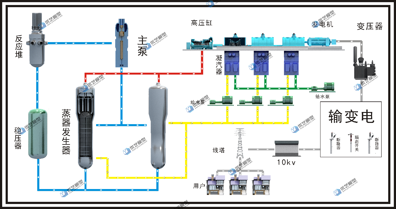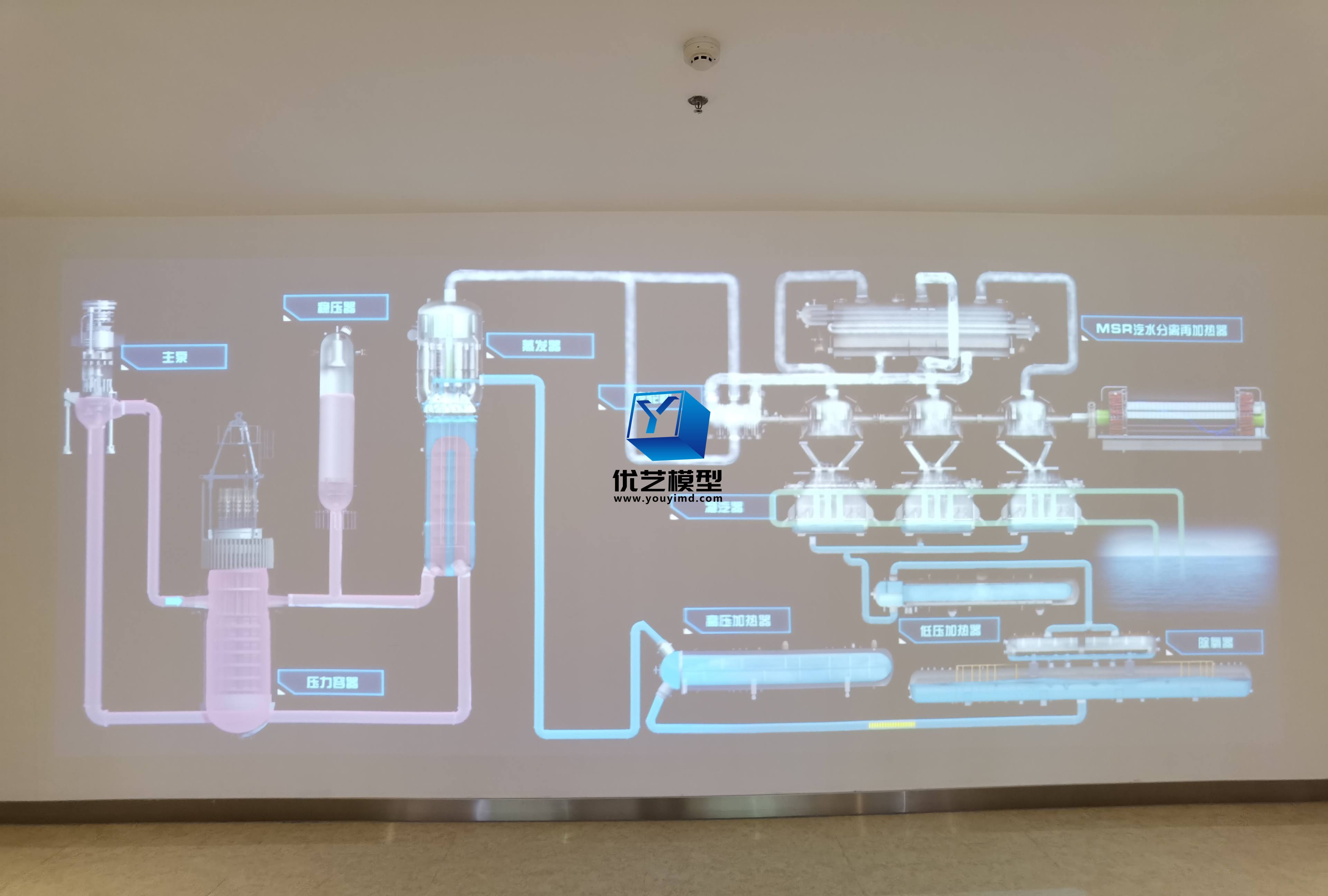 該模型設(shè)計了15個控制點,分別為一次回路;二次回路;汽輪機檔位1,汽輪機檔位2,汽輪機檔位3,隔離開關(guān)1,斷路器,隔離開關(guān)2,電力輸送,10kv變電房,用戶,環(huán)境............等!展現(xiàn)了從核島至用戶的核電產(chǎn)生,傳輸,入戶的完整工藝流程,主要其展現(xiàn)了其中任意環(huán)節(jié)出現(xiàn)安全風(fēng)險后,帶來的對應(yīng)效果,及備用措施............等!