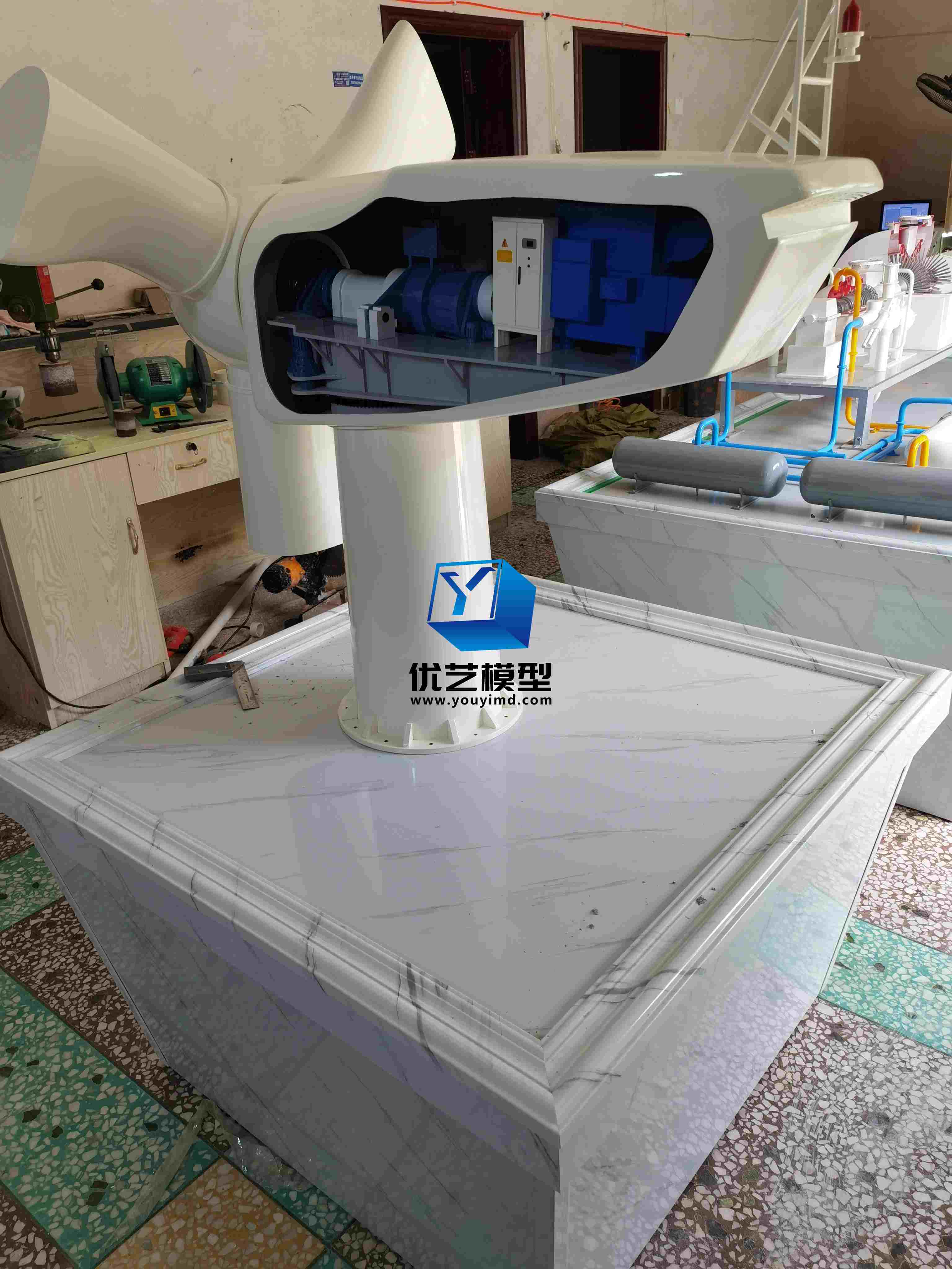 2,風(fēng)機(jī)模型主要制作結(jié)構(gòu)部件:導(dǎo)流罩、輪轂、葉片(截?cái)嗍秸故荆⑺?、機(jī)艙、機(jī)架,偏航電機(jī)、主軸承、齒輪增速箱、發(fā)電機(jī)、電器柜、控制柜、風(fēng)向標(biāo)、風(fēng)速儀。以上部件可通過(guò)剖面機(jī)艙直觀觀看到。