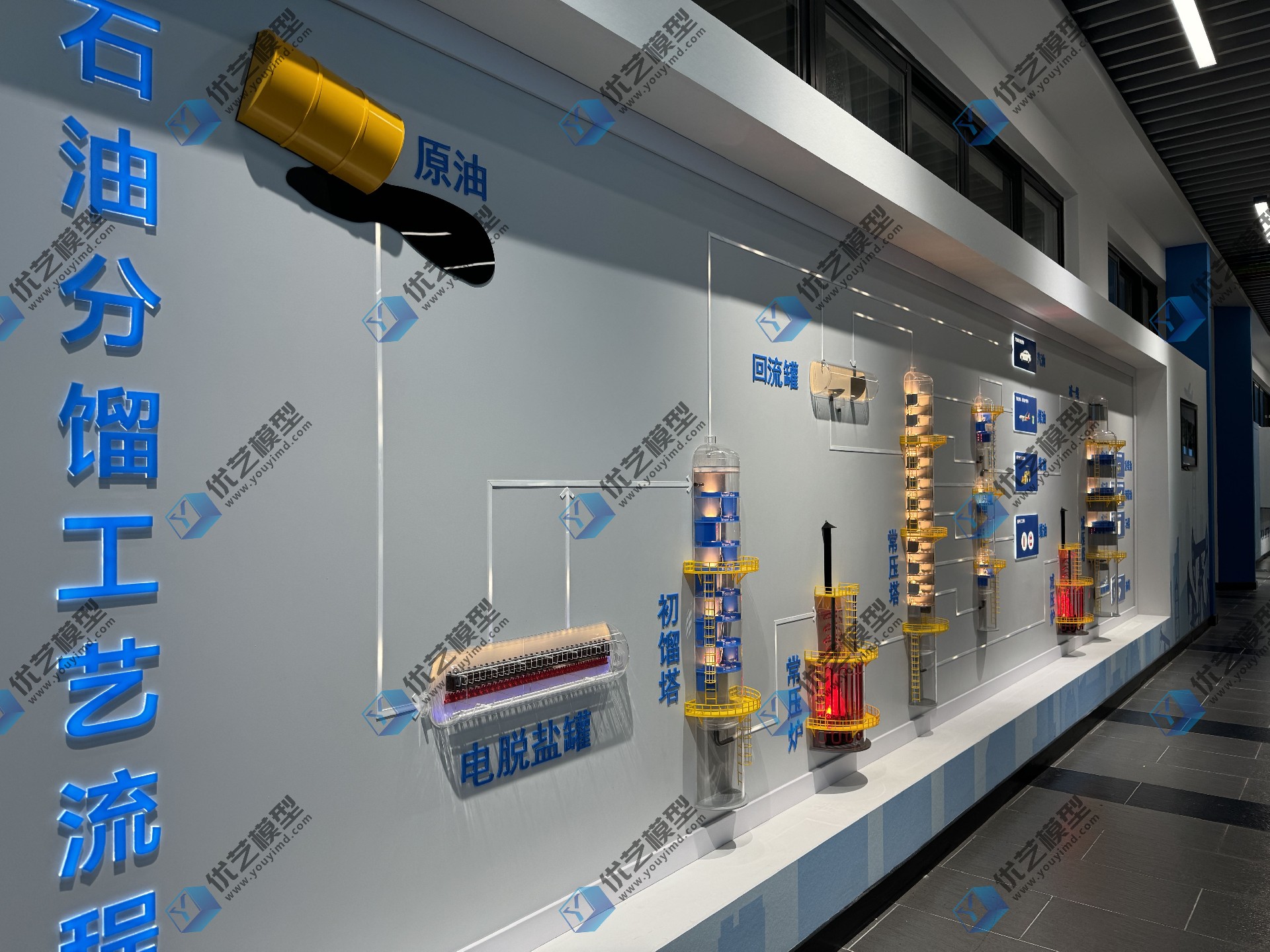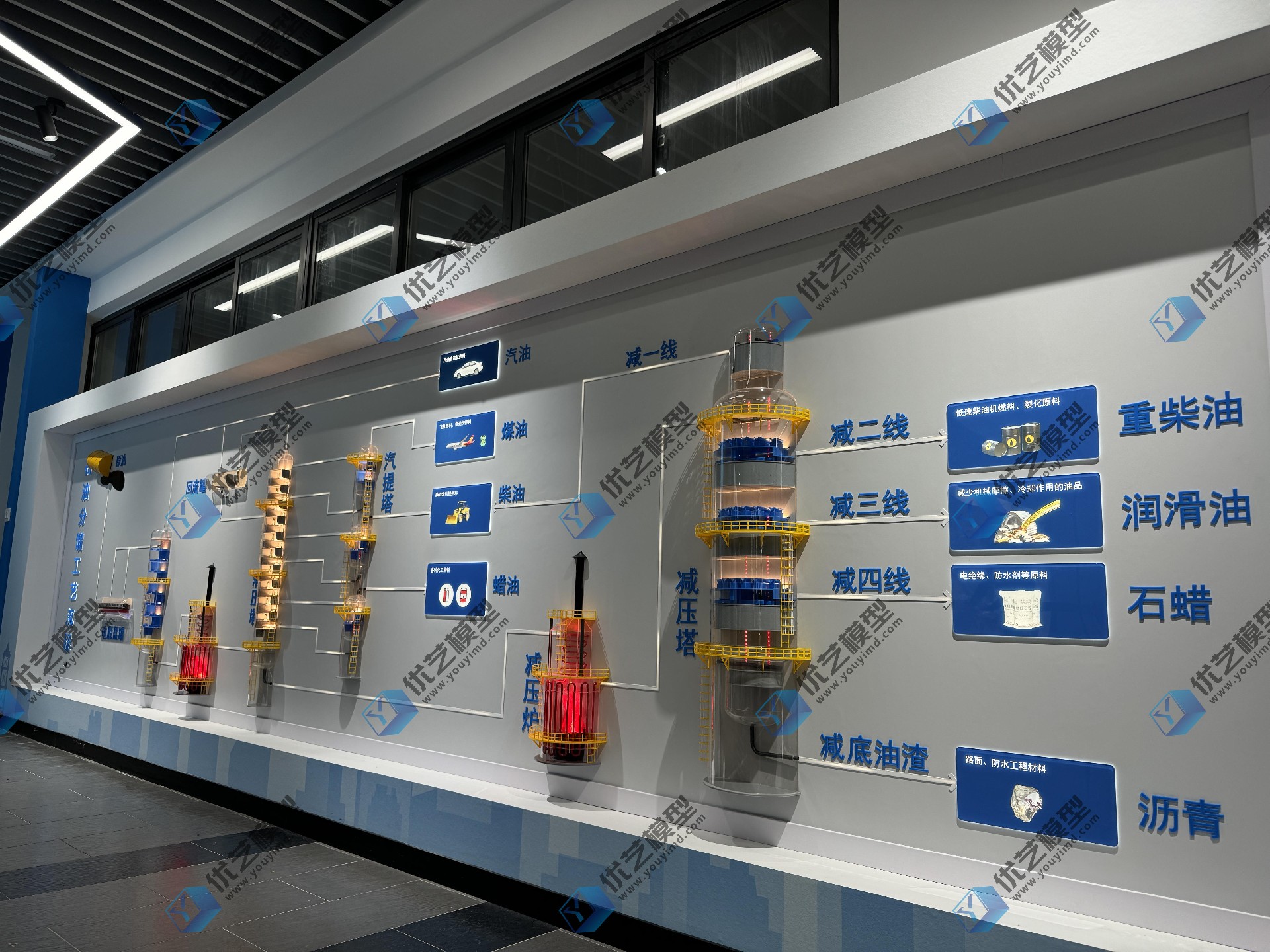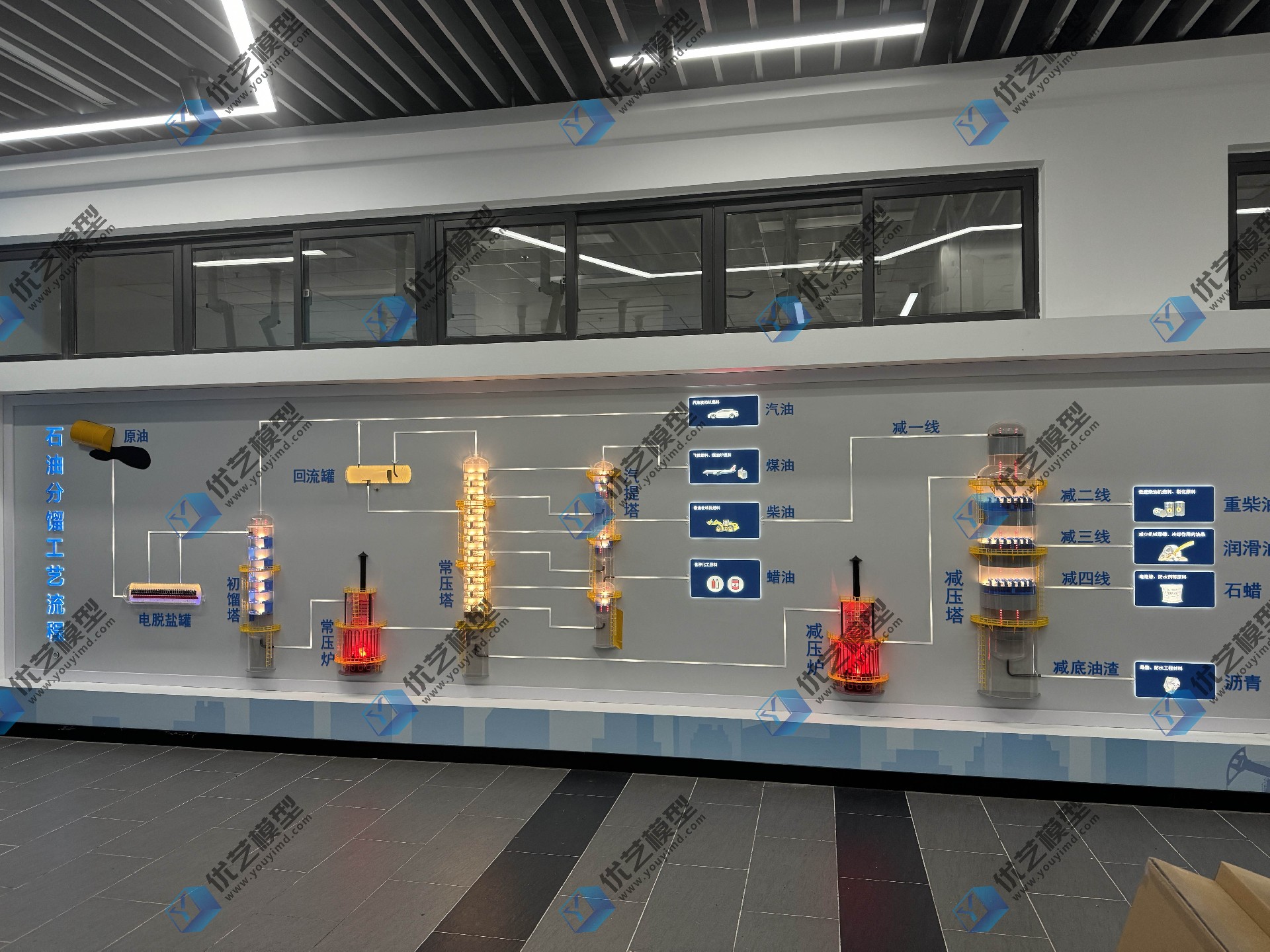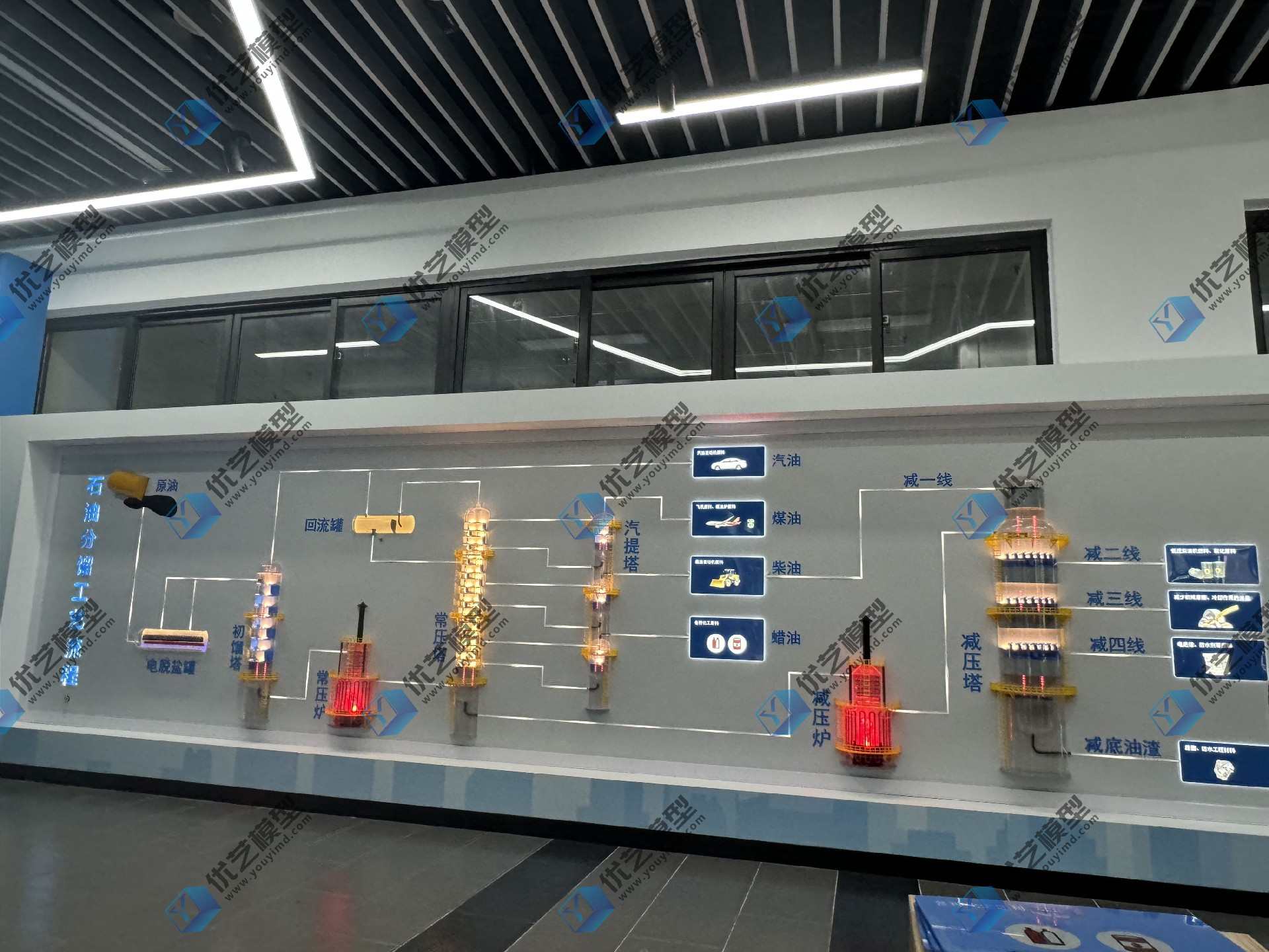 石油分餾全流程大型透明教學(xué)模型!由湖南優(yōu)藝模型匠心打造,全長6.8米的立體裝置清晰還原原油到成品油的蛻變之旅。模型采用半剖透明設(shè)計,配合流動LED光效動態(tài)展示——從電脫鹽預(yù)處理、初餾提純,到常壓爐加熱分層、減壓塔精密分離,完整呈現(xiàn)原油通過不同沸點分離出柴油、煤油等組分核心原理。精準(zhǔn)復(fù)刻真實煉化設(shè)備,常壓塔與減壓塔聯(lián)動演示。無論是高?;ふn堂,還是企業(yè)實訓(xùn)基地的工藝流程科普,讓學(xué)習(xí)者直觀掌握石油煉制分離奧秘